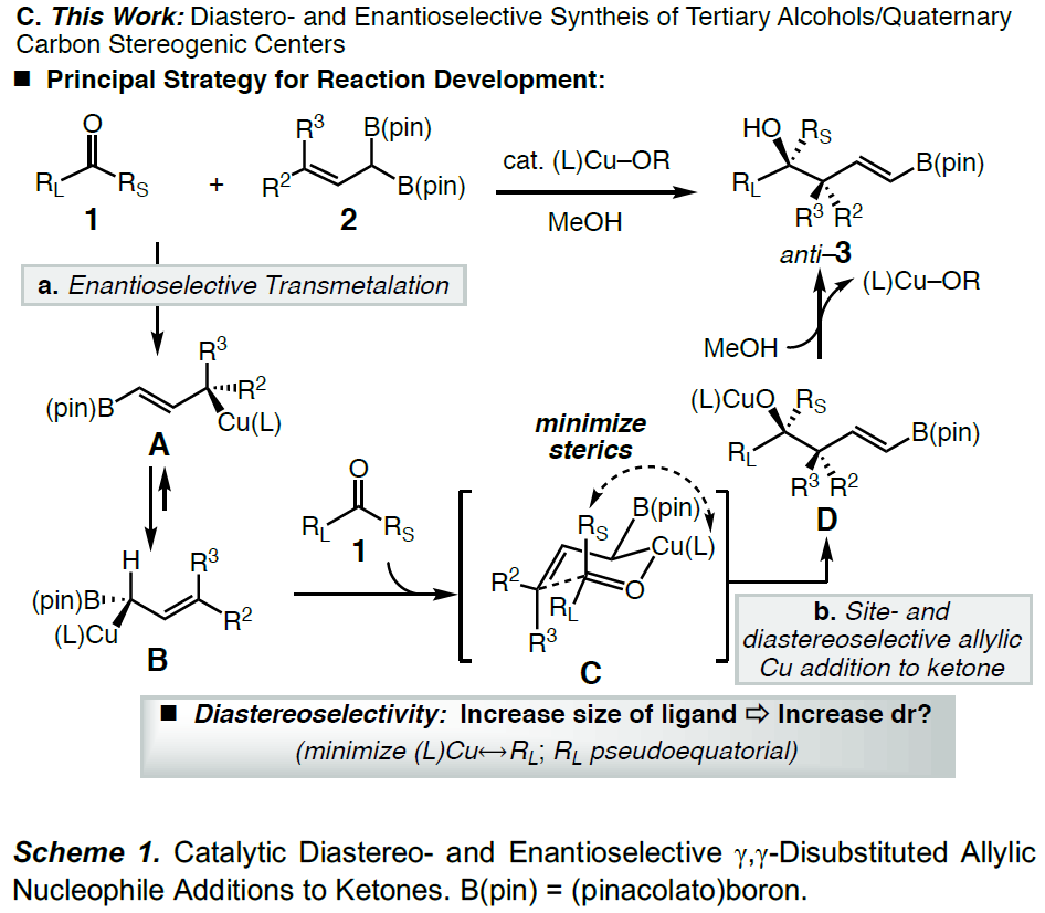 为了解决上述的问题,作者开发一种通用的催化烯丙基亲核试剂立体选择性加成策略, 用于合成邻位含有叔醇的季碳中心的产物(Scheme 1C),该方法集中在催化剂控制的γ,γ-二取代的烯丙基二硼酸酯(可用于醇和胺的对映选择性合成)与酮的1,2-加成反应上。在这方面,作者设想了催化反应,首先是在原位生成的(L)-Cu-OMe与烯丙基二硼之间进行对映选择性SE2’金属迁移过程形成四元烯丙基铜中间体A,A经快速的表面转移,从而获得空间较小并且能量更高的α-硼基-Cu物种B,紧接着再与酮反应获得中间体C,再经旋转和迁移获得最稳定的D,最后在甲醇中再生(L)-Cu-OMe,同时获得目标产物。