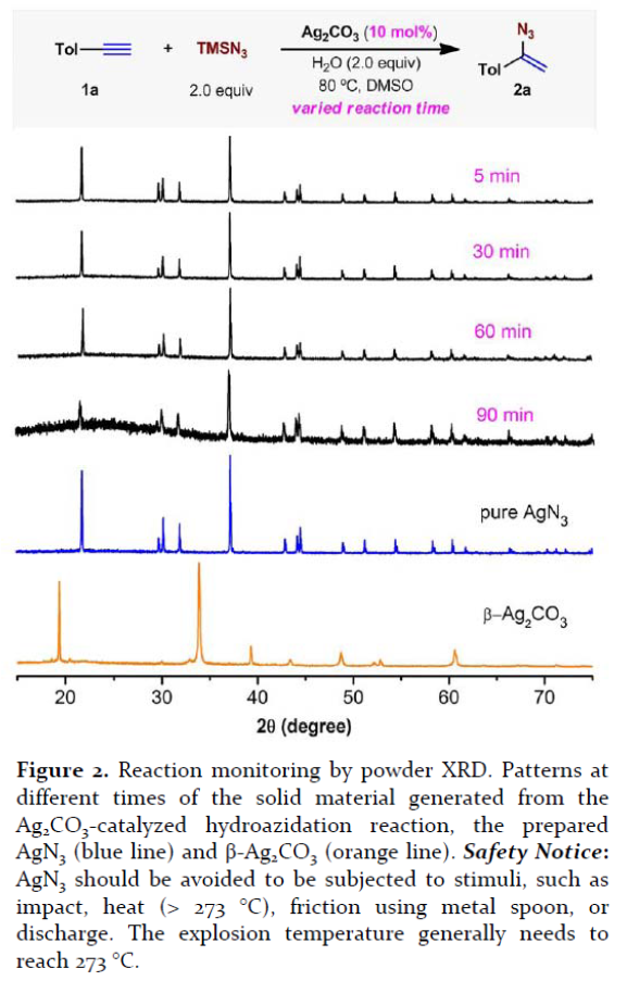 首先,作者选择对甲苯基乙炔1a作为模型反应物,对Ag2CO3催化的加氢叠氮化反应进行了相关的XRD研究(Figure 2)。XRD分析结果表明,Ag2CO3可在5min内快速且完全转化为AgN3,而叠氮化乙烯产物2a尚未观察到。此外,其它几组对照实验与纯AgN3的对比说明,该反应中AgN3作为真正的催化物。同时,该方法作为首次使用XRD对银盐催化有机反应的研究。