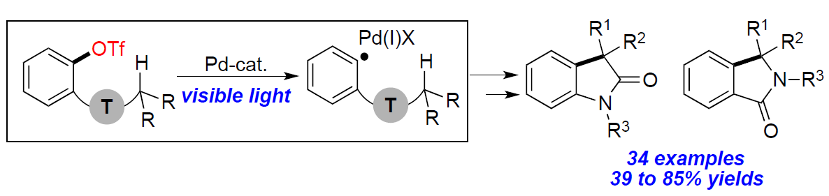 伊利诺伊大学的Vladimir Gevorgyan教授团队报道了将可见光与钯催化相结合,实现芳基三氟甲磺酸酯中C(sp2)-O键断裂,从而获得芳基Pd(I)-自由基中间体,随后再经1,5-HAT/环化/芳香化获得不同取代的羟吲哚和异吲哚啉-1-酮衍生物。此外,该方案可以合成传统的Pd催化体系不易合成的具有碱性敏感基团(如酮和酯)的羟吲哚产物。