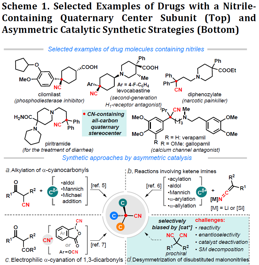 含有腈基团的化合物,在药物中具有重要的作用。生物相容性以及代谢稳定的腈基团,具有促进极性相互作用、增强氢键键合性质、改善分子的毒理学特征等优点。据文献报道,含腈基团的药物已广泛存在于各类临床候选药物中。而具有生物活性的腈基化合物特别重要(Scheme 1),可防止腈在α-碳上的氧化,避免有毒氰化物的释放。此外,腈也是有机合成中最有用的官能团之一,可以轻松转化为一些通用的官能团,例如羧酸、醛、胺、恶唑啉和哌啶等。因此,一些文献也报道了相关的催化方案,用于合成含腈的全碳四元立体中心化合物,如α-氰基羰基的亲电官能化(Scheme 1a)、乙烯酮亚胺的亲电官能化(Scheme 1b)、1,3-二羰基的α-氰化反应(Scheme 1c)等。