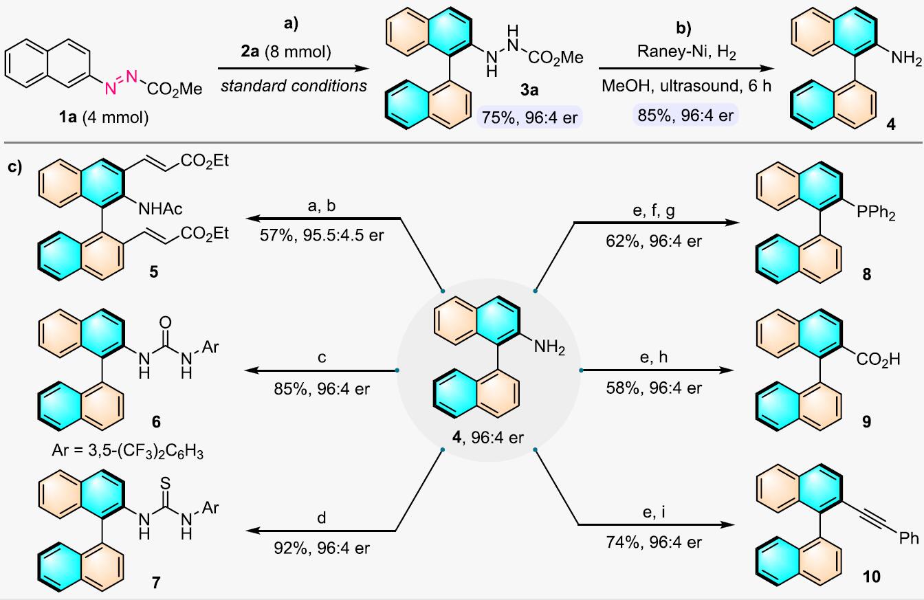 为了证明反应的应用潜力,作者进行了一系列衍生反应(Figure 2)。首先,在最优反应条件下,扩大化反应可以很好地进行,收率稍微有所降低但对映选择性较好。然后,通过简单的还原反应3a可转化为轴向性2-氨基联萘化合物4。4可以再转化为具有催化作用的轴手性硫脲类结构以及其他重要的轴手性结构。