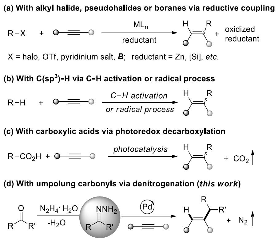 加拿大麦吉尔大学李朝军课题组报道了氮气条件下,新型Pd催化羰基极性翻转后作为新型烷基碳负离子等价物与炔烃发生顺式-氢烷基化反应,能以良好的收率和优秀的区域选择性得到(Z)-烯烃产物。该策略成功的克服了炔烃易聚合且未活化的炔烃难与亲核试剂发生直接加成反应等难题,为炔烃的合成提供了一种新的高效方法。