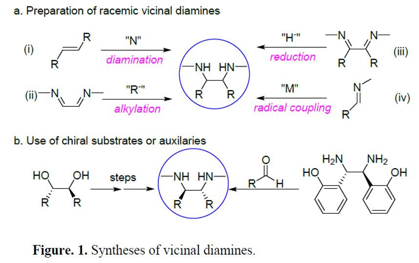 手性邻二胺化合物广泛存在药物分子、天然产物、农用化学品以及不对称催化领域中的配体或催化剂中。然而,大多数已知方法(Figure 1a)包括烯烃二氨化、二亚胺的亲核加成、二亚胺还原和亚胺的自由基偶联等,只会形成邻二胺的外消旋混合物,一半不是目标产物。此外,繁琐的纯化程序以及内消旋非对映异构体的存在,导致收率偏低。虽然,可以通过手性化合物合成目标产物(收率高),但需使用昂贵的手性原料(Figure 1b)。因此,高效且实用可合成具有优异收率和选择性的手性邻二胺化合物仍具有挑战。在此,上海有机所汤文军教授课题组报道了一种通用、简单且实用的手性邻二胺化合物的合成方法,即手性联硼酸酯促进亚胺的还原偶联反应。该反应具有高收率、优异的对映选择性、反应条件温和、操作简单、原料易获、底物范围广泛等特点。