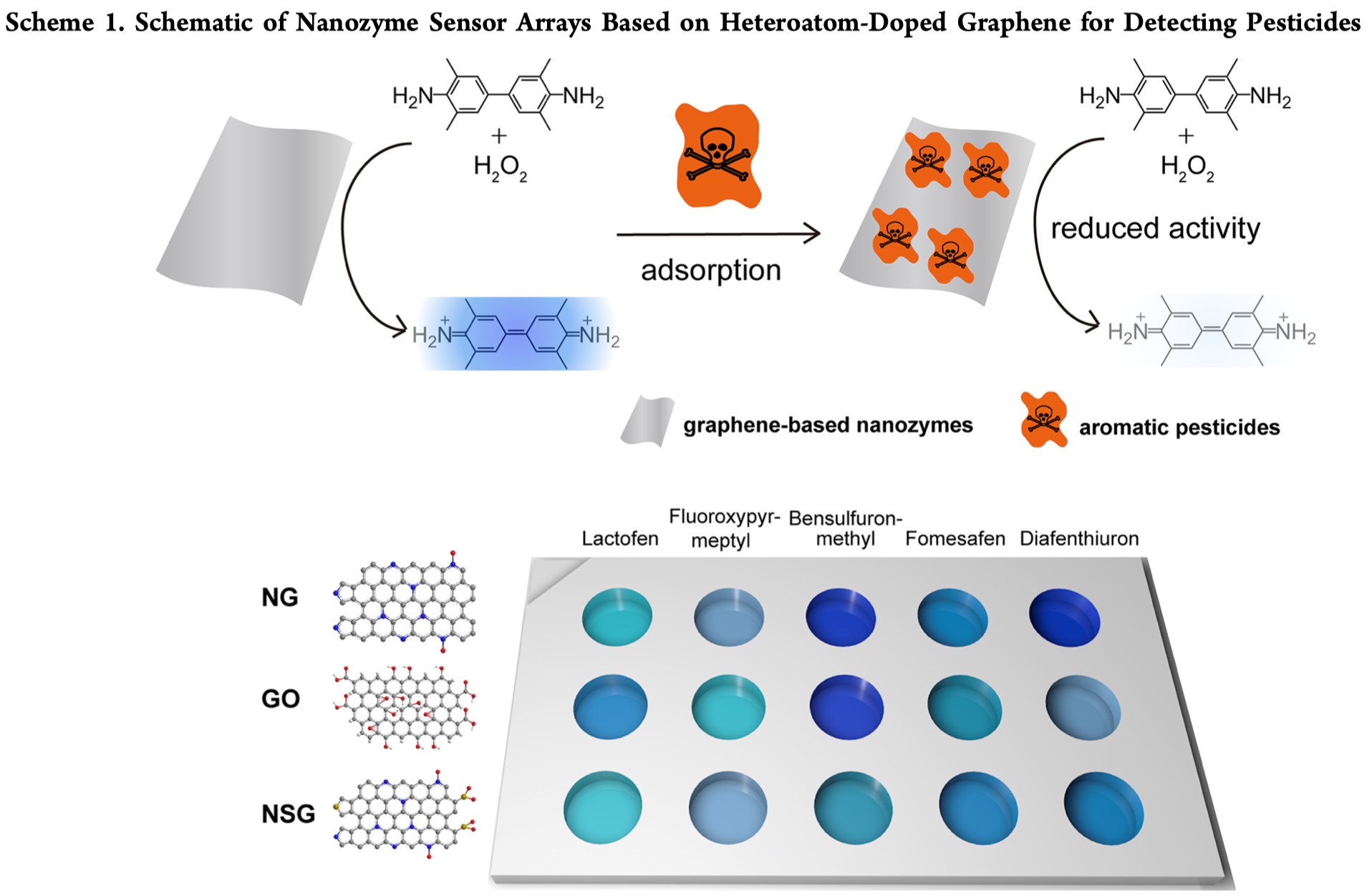 南京大学的魏辉教授课题组基于杂原子掺杂的石墨烯构建了纳米酶传感器阵列。在芳香族农药的存在下,纳米酶的活性位点被吸附而掩盖,导致其模拟过氧化物酶活性降低。制备的纳米酶传感器阵列在区分五种不同农药和每种农药的不同浓度方面均表现出良好的性能。此外,作者还验证了区分两种混合农药的不同比例和实际样品中农药的可行性。这项工作提供了一种交叉响应且成本经济的方法来检测芳香族农药,并有望将这一方法应用于检测更多农药中。