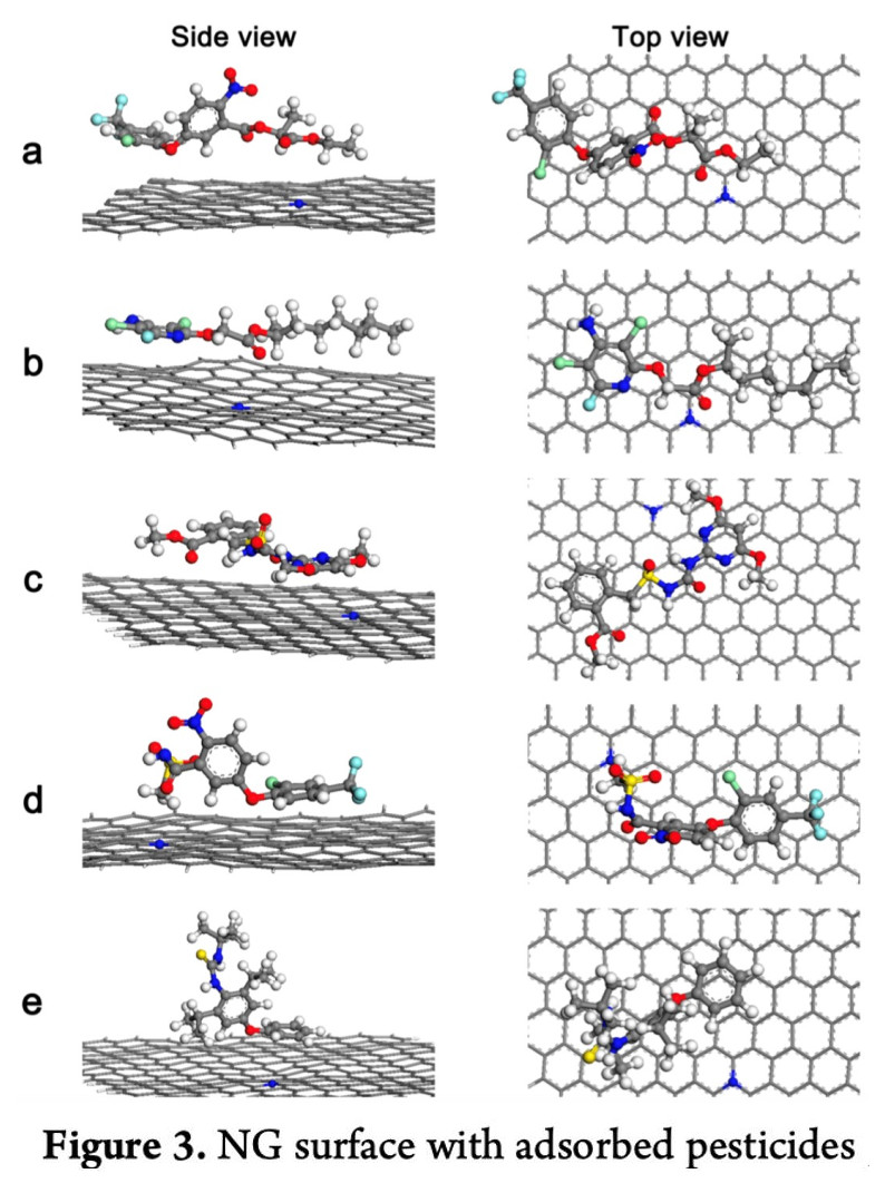 为了进一步研究基于石墨烯的纳米酶与农药之间的吸附相互作用,作者进行了分子动力学计算,来探究活性位点如何被农药阻断。根据之前的研究,NG中的石墨N和GO中的羧基被验证为模拟过氧化物酶的催化活性位点。因此,作者构建了具有石墨N和带有羧基的GO的NG模型。对于NSG模型的实验结果表明,NSG的活性并未提高,但随着氮和硫共掺杂而有所降低,作者假设靠近噻吩S的石墨N是活性位点,并构建了三种可能的模型(详见SI)。然后,作者对五种农药在这些掺杂的石墨烯表面上的吸附进行了计算,优化后的结果阐明了农药在石墨烯表面上的可能结合位点和方向。在NG和NSG中,农药通过π-π堆积相互作用吸附在NG和NSG的表面上,将那些活性石墨N位点封闭,如Figure 3所示。对于GO,农药也通过π-π堆积相互作用吸附在GO的表面,将羧基封闭。除π-π堆积相互作用外,fomesafen和羧基之间也可以形成氢键,从而导致更高的亲和力和更强的抑制作用。