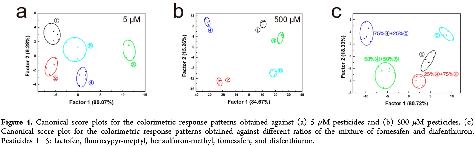 然后作者验证了其区分两种不同比例混合农药的可行性。Fomesafen和diafenthiuron都是白色粉末,且都可以喷洒在大豆田中,仅通过肉眼很难区分它们的混合物。作者设计了不同的比例,并用传感器阵列对其进行区分(Figure 4c)。具有不同摩尔比的混合物被很好的分成了五个组,并且彼此分离,这证明了传感器阵列对农药的多重检测能力。