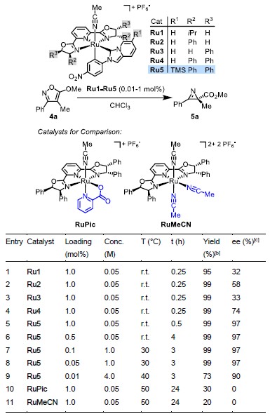 作者合成了一系列的新型Ru-pybox催化剂,然后以异恶唑1为模板底物,通过对催化剂、催化剂用量以及反应温度等反应条件反复筛选,确定最优反应条件(Table 1):0.1 mol%Ru5为催化剂,CHCl3为溶剂,在30℃条件下反应3小时,能以99%的收率和97%的对映选择性得到产物5a。