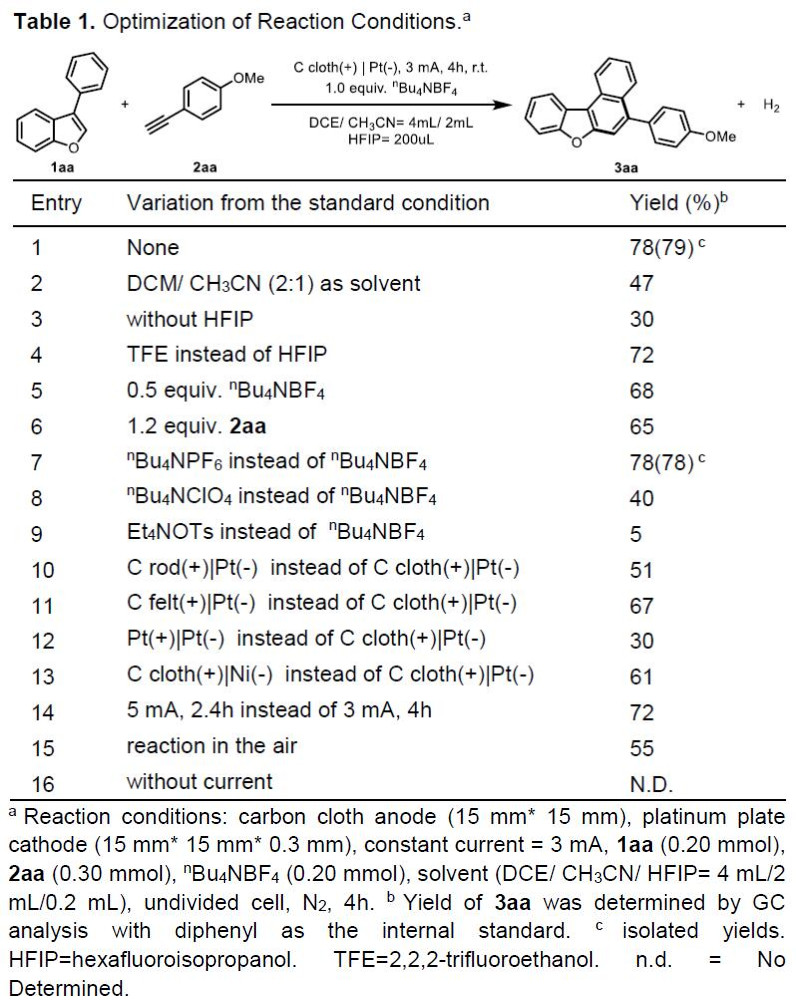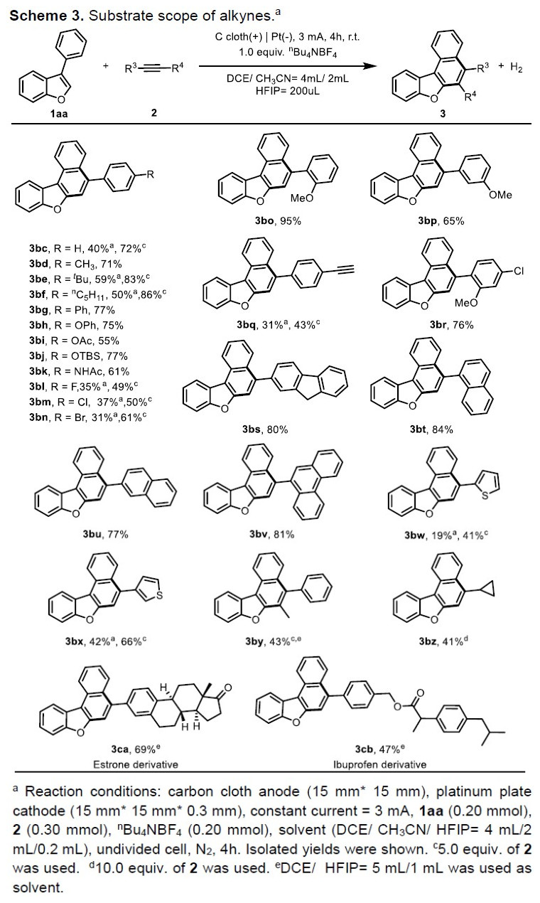 首先,作者以3-苯基苯并呋喃1aa和4-乙炔基苯甲醚2aa作为模型底物,进行了相关[4+2]环化反应条件的筛选(Table 1)。经过大量的筛选之后,作者发现,当在碳阳极和铂阴极的无隔膜电解槽中,在惰性气氛保护下,于DCE/MeCN/HFIP的混合溶剂以3 mA室温反应4h,即可获得79%收率的产物3aa(entry 1)。而使用DCM/MeCN=2:1混合溶剂,收率明显下降(entry 2)。同时,含氟的助溶剂对于转化至关重要,它可以稳定自由基阳离子。如在没有HFIP时,3aa的收率降至30%(entry 3)。而与六氟异丙醇相比,三氟乙醇具有相似的反应活性(entry 4)。此外,电解质或炔烃2aa的减少,收率会有所降低(entries 5-6)。若将电解质更改为nBu4NPF6也具有良好的反应性,但使用nBu4NClO4和Et4NOT时,反应效率明显下降(entries 7-9)。而对电极材料的筛选中,如碳棒阳极、碳毡阳极、铂板阳极或镍板阴极,均没有提高收率(entries 10-13)。而将电流增加到5 mA时,产率较低(entry 14)。此外,在无氮气保护时,环化反应仍能顺利进行,但收率降低(entry 15),若无电流时则不发生反应(entry 16)。