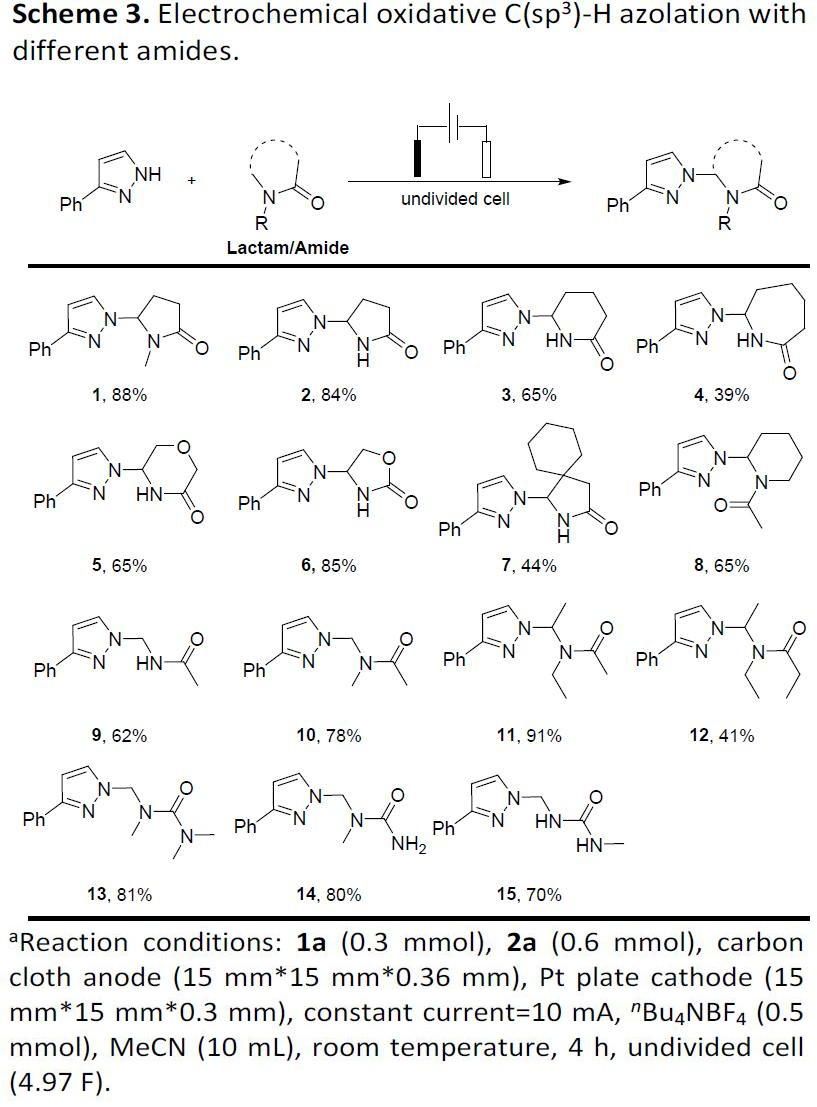 首先,作者使用3-苯基-1H-吡唑和1-甲基-2-吡咯烷酮进行反应条件的筛选(Table 2)。经过大量条件的筛选,作者发现,当使用碳阳极和铂阴极,在10 mA恒流下室温反应4 h,可获得88%的收率产物1(entry 1)。在保持电量恒定(4.97 F),适当增加或减少恒定电流,收率有所下降(entries 2-3)。而使用廉价的镍作为阴极时,收率也有所下降(entry 4)。而对电解质的筛选中,nBu4NBF4作为最佳电解质(entries 5-7)。而对溶剂的筛选时,均使收率大幅下降或不反应(entries 8-10)。此外,在空气中反应时仅获得52%收率的产物,并通过GC-MS检测到N-甲基琥珀酰亚胺(entry 11)。而在没有电流时,则不发生反应(entry 12)。