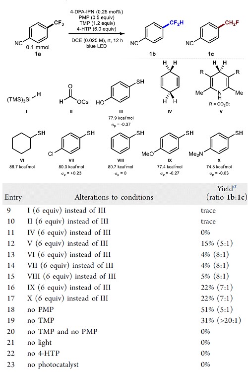 首先,作者用4-(三氟甲基)苄腈1a进行了相关的条件筛选。按照Prakash或Lalic所报道的实验条件,未形成任何产品1b(entries 1-2)。此外,使用三氟甲基芳烃进行已知的光氧化还原脱氟所应用的条件主要是原料的剩余(entries 3-5)。由于与富含电子的底物相比,来自缺乏电子底物1a的二氟化苄基自由基的亲电性更强。作者考察了除甲酸铯以外的氢原子供体(HAD)。令人高兴的是,在可见光条件下1a在2.5 mol% fac-Ir(ppy),4-HTP,TMP和PMP)的组合存在下,在DCE中以5:1的选择性(1b:1c)得到53% 的产物并且未检测到完全还原的4-甲基苯甲腈产品(entry 6)。通过更换有机催化剂4-DPA-IPN获得63 %的产物,选择性不变(entry 7)以及降低催化剂的用量不会影响反应结果(entry 8)(Scheme 3)。在其他类似的反应条件下,考察了氢原子给体(包括除4-HTP,1,4-环己二烯,Hantzsch酯,(Me3Si)3SiH或CsOCOH以外的硫醇)在其他类似的反应条件下(entry 9-17)较少或不合适(Scheme 4)。 综上发现,光催化剂,HAD,碱和蓝光是进行该加氢脱氟的必要成分。