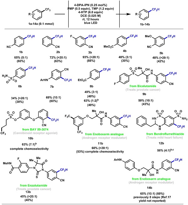 仅在芳烃上面发生反应;具有三个三氟甲基芳基的Enobosarm(10a)的类似物的加氢脱氟化发生在单个位点,具有出色的CF2H / CH2F选择性(> 20:1),并且通过对照实验发现表明3,5-双三氟甲基苯在该反应条件下不反应;一种通过血管舒张治疗轻度心力衰竭和高血压的药物Bendroflumethiazide(12a)和治疗前列腺癌的激素治疗药物Enzalutamide(13a)也可以中等产率获得产物12b和13b。而产物14b原先是通过8步制备,按照作者的方案通过两步就可以60%产率获得。