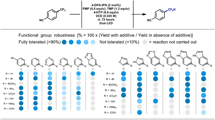 牛津大学Véronique Gouverneur教授课题组,以4-DPA-IPN为有机光催化剂,26-对羟基硫酚为HAD,蓝光为光源,实现了贫电子三氟甲基芳烃的加氢脱氟反应。该方法可耐受药物化学程序中经常出现的各种官能团和杂芳烃,并可以将复杂的三氟甲基化药物直接转化为其二氟甲基类似物。 机理研究证明了光催化剂被HAD还原并被充当氧化剂的三氟甲基芳烃使得其恢复返回自然氧化态的催化循环。
