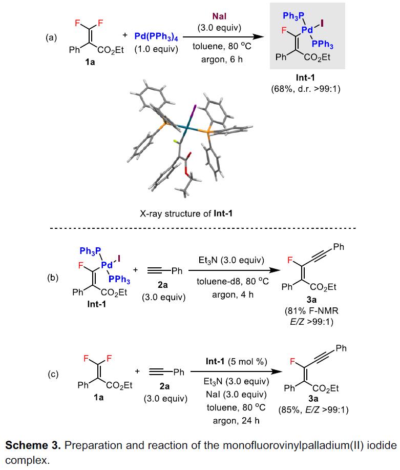 为了进一步了解反应的机理,作者进行了相关的对照实验(Scheme 3)。当1a与Pd(PPh3)4在NaI存在下进行反应时,作者进行相关的分离,从而获得一种新型的单氟乙烯基碘化钯(II)中间体Int-1,并通过X-射线晶体结构,进一步表明了Pd与两个PPh3配体之间存在反式结构(Scheme 3a),作为衍生自双二氟烯烃的钯络合物的首次报道。此外,Pd配合物Int-1与末端炔烃2a反应,可以获得高收率的产物(E)–3a,证明了Int-1作为该催化循环中关键性的中间体(Scheme 3b)。同时,在标准条件下,使用催化量的Int-1,也可获得较高收率的 (E)–3a,证明了Int-1具有一定的催化循环能力(Scheme 3c)。