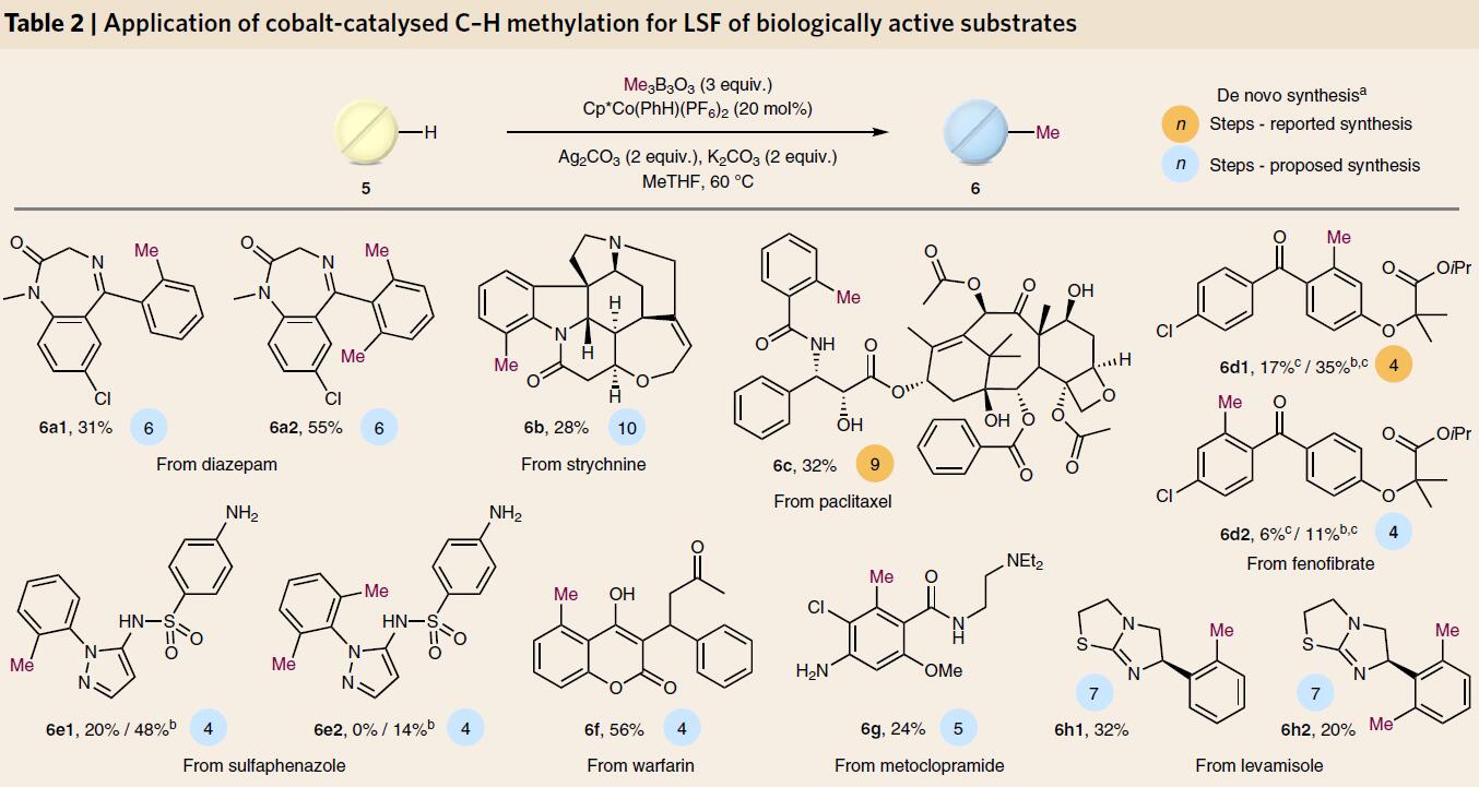 神奇的甲基效应(magic methyl effect)在药物化学中众所周知,然而对于药物分子的后期修仍具有一定的挑战。为了克服这一难题,瑞典阿斯利康公司(AstraZeneca)的Magnus J. Johansson和德国哥廷根大学的Lutz Ackermann教授在自然化学(Nature Chemistry)杂志上发表论文,通过钴催化剂,实现了对复杂药物分子后期的C-H甲基化反应。依赖于硼的甲基化试剂,同时利用分子内在的导向基团来活化C-H键,该反应具有广泛的适用性。此外,该反应无需预功能化或后脱保护,即可对各种市售药物分子和天然产物进行甲基化。同时,理化性质和生物学测试也证实了这种看似微小的结构变化,会影响重要的药物特性。