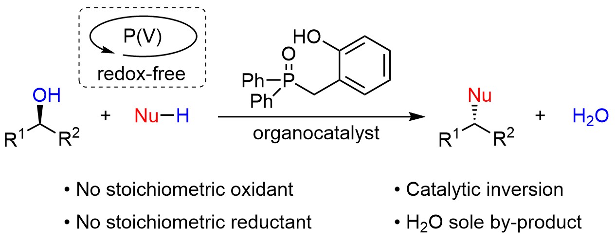 醇类化合物的亲核取代反应是有机化学中最基础且应用最广泛的反应之一,过去的半世纪时间里Mitsunobu反应(光延反应)一直是将醇类化合物经亲核取代转化为立体专一性其他官能化产物的有效方法,然而反应必须依赖化学计量的三苯基膦和危险的偶氮试剂,同时也不可避免产生化学计量的副产物为后续分离纯化带来困难,这种低原子经济性的反应显然也不符合现今倡导的绿色可持续化学理念。鉴于此,英国诺丁汉大学的Denton教授等人精心设计了可参与催化循环的氧化膦(phosphine oxide)有机催化剂,无需借助任何化学计量的氧化剂和还原剂即可实现催化的Mitsunobu反应,整个过程中唯一的副产物是H2O,改良后的方法还可用于C-N键和C-S键的构建以及复杂天然产物的结构修饰,具有非常广阔的应用前景,目前相关成果发表于国际顶级期刊: