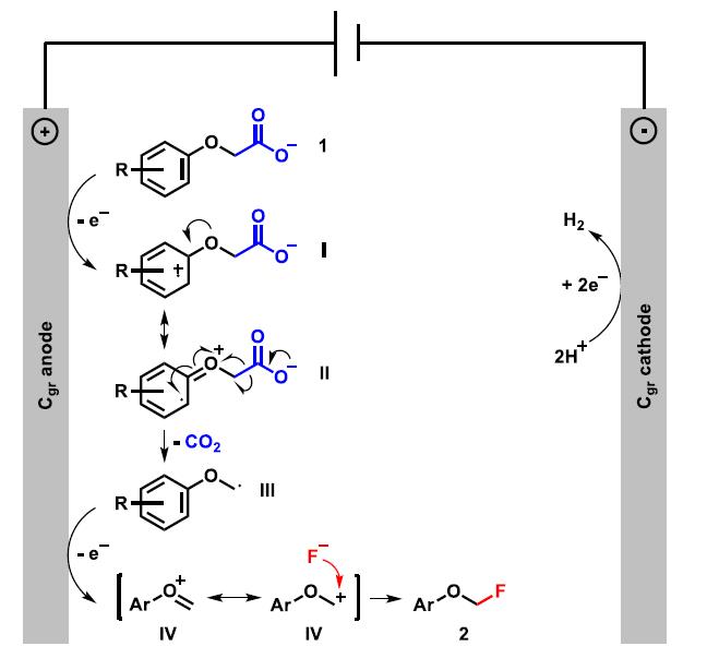 最后,让我们一睹电化学反应的机理,这个反应类似于Pseudo-Kolbe型电化学合成,电子在连接羧酸部位的发生转移,而不是发生在羧酸本身。芳氧基羧酸1在阳极氧化为自由基阳离子Ⅰ,然后等排为氧鎓离子Ⅱ,脱羧后生成自由基Ⅲ,但自由基Ⅲ的溶剂化能力差,容易再次被氧化为氧鎓离子Ⅳ,等排为碳正离子Ⅳ,随后被氟亲核试剂进攻,生成醚2,如图4所示。