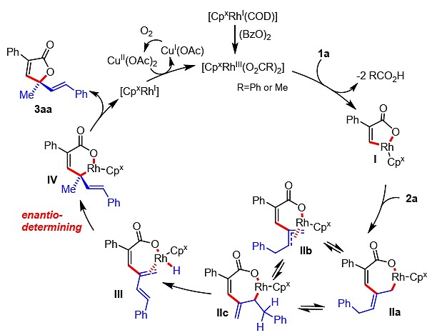 作者提出了该丙烯酸类化合物不对称C-H活化反应的催化循环(图5)。首先CpxRhI经(BzO)2氧化形成活性CpxRhII配合物,再与底物1a进行配体交换,经CMD型定向烯基C-H活化形成五元结构I。紧接着,2a插入得到中间体IIa–IIc,经β-氢消除生成三烯中间体III。随后,生成中间体IV(对映选择性的决定步)。最后,经还原消除后产生内酯3aa并产生CpxRhI物种(经Cu(OAc)2氧化,形成CpxRhII参与下一个催化循环,CuII由氧气氧化再生)。