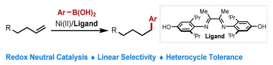 有机所王鹏教授课题组报道了NiII催化的中性氧化还原反应,首次实现烯烃(未活化)与苯硼酸的线性选择性氢芳化反应。值得注意的是,富电子的二亚胺配体对于反应至关重要。同时,该反应具有宽泛的底物范围、温和的反应条件、无需使用其他氧化剂和还原剂、良好的官能团耐受性等优点。