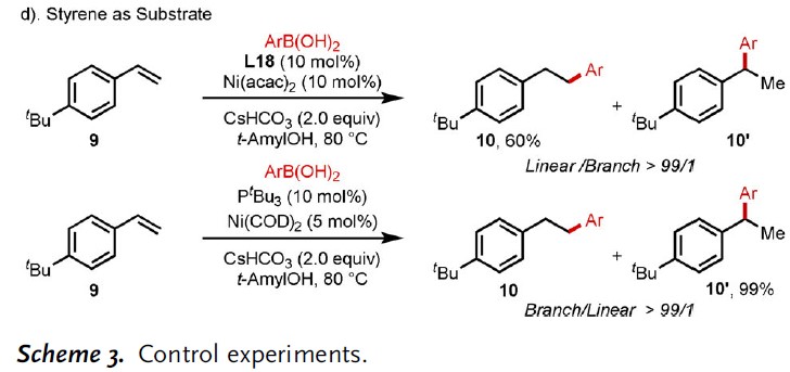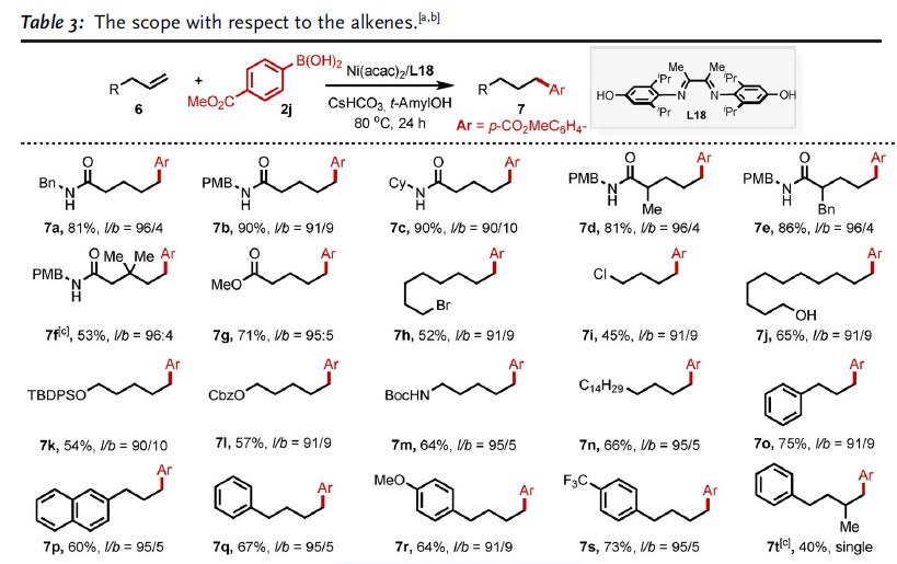 首先,作者以未活化的烯烃1和苯硼酸2a作为模型底物,进行了相关配体的筛选(Table 1)。通过线性/分支选择性表明,二亚胺配体(L9–L18)具有抑制Heck型副产物5的能力(可能是由于β-H消除反应迟缓所致)。因此,作者继续对二亚胺配体进行了修饰,最终具有富电子的对羟基取代配体L18可将收率提高至83%,线性/支链选择性为91/9。值得注意的是,假设在碱性条件下酚羟基可以转化为苯酚离子,因此提供了高度富电子的二亚胺配体,该配体能够在整个催化循环中稳定NiII催化剂。