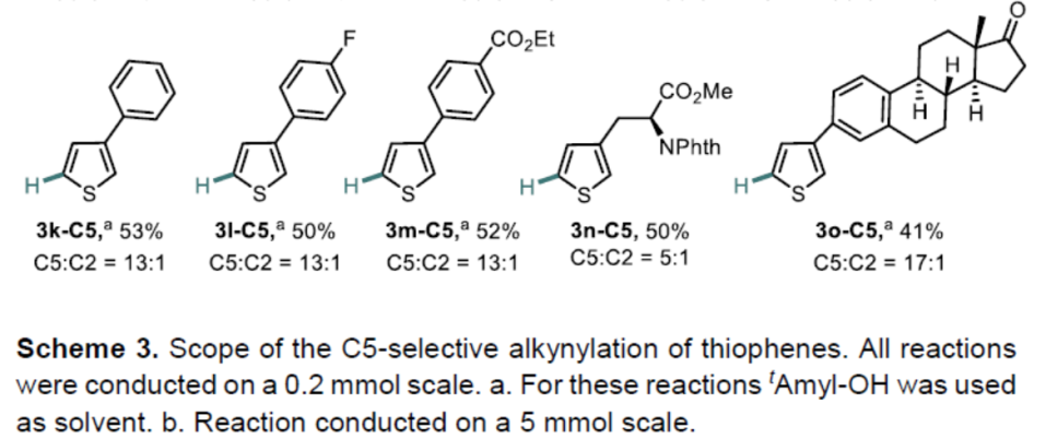 [1] J. P. Brand, J. Waser, Angew. Chem. Int. Ed. 2010, 49, 7304.[2] a) X. Jie, Y. Shang, P. Hu, W. Su, Angew. Chem. Int. Ed. 2013, 52,3630; b) additionally, a single example of a C5-selective alkynylationwith a 2,3-disubstituted thiophene substrate has been described by Liand coworkers: B. Liu, W. Ouyang, J. Nie, Y. Gao, K. Feng, Y. Huo, Q.Chen, X. Li, Chem. Commun 2020, DOI: 10.1039/D0CC04739B.