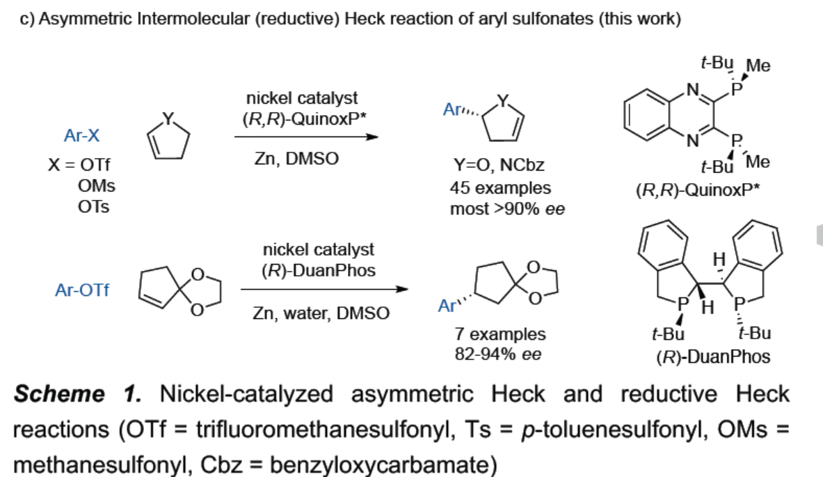 北京大学深圳研究生院周建荣课题组通过使用NiCl2[(R,R)-QuinoxP*]作为催化剂,实现了 Ar-X(X=OTf、OMs和OTs)与环烯烃的不对称分子间Heck反应以及2-环戊烯酮缩酮底物的不对称还原Heck芳基化反应。
