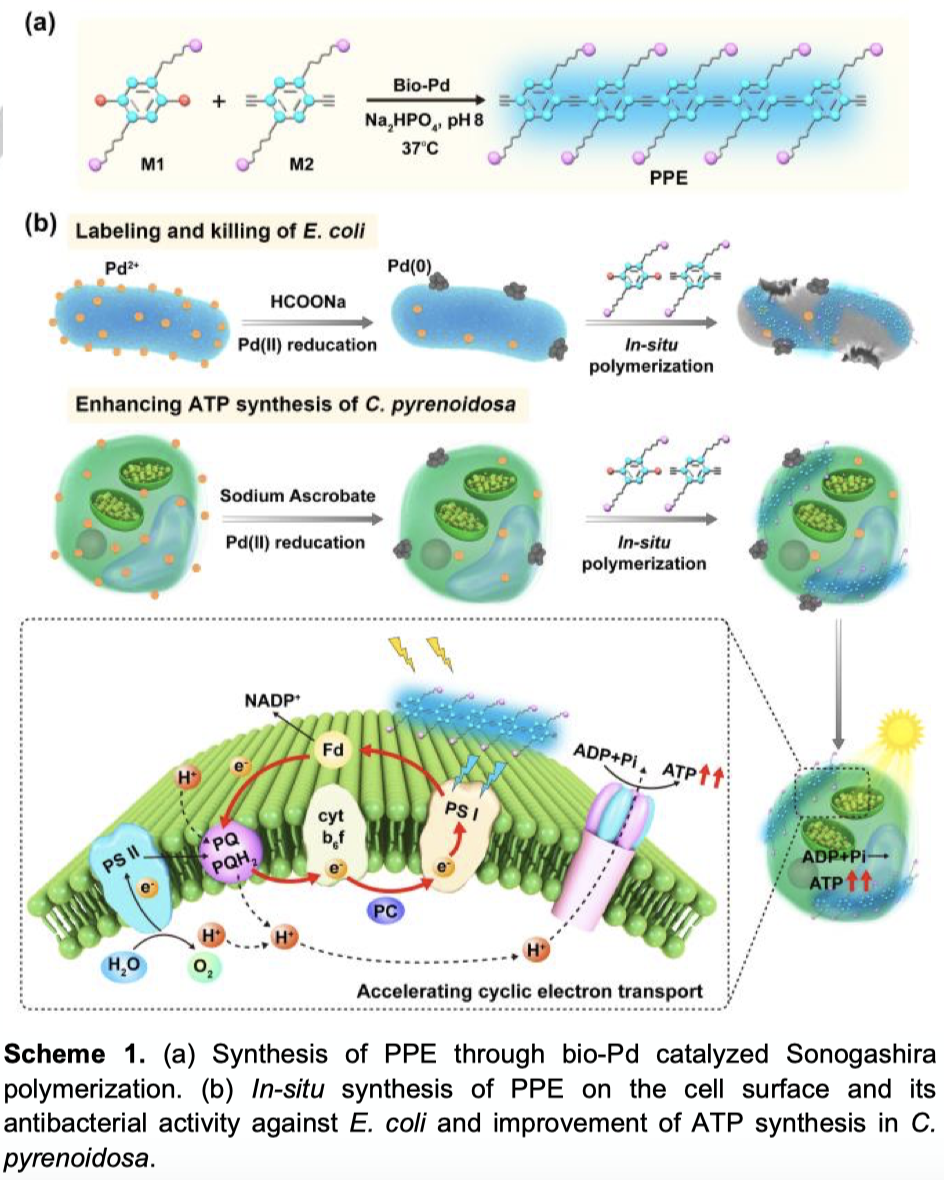 在活细胞系统中已经实现了钯催化的偶联反应,用于标记和药物合成等。细胞表面具有多个钯结合位点,包括羧基、氨基和磷酸基团等,有利于钯纳米颗粒的形成。此外,在细菌表面形成的钯纳米颗粒(bio-Pd)在Heck反应中表现出比胶体Pd更高的催化活性。因此,作者设计了一种新的原位聚合系统,使用细胞表面的bio-Pd来催化Sonagashira聚合反应,生成光敏的聚对苯撑乙炔(PPE)以修饰细胞表面(Scheme 1a)。该PPE带正电,可以通过静电相互作用与带负电的细胞表面相结合。由于PPE发蓝色荧光,因此可以验证细胞表面聚合物的形成。凭借共轭聚合物较强的吸光能力,它展现出对E.coli的抗菌活性和促进C.pyrenoidosa中ATP的合成,为原位聚合调控生物功能提供了一种新的策略。