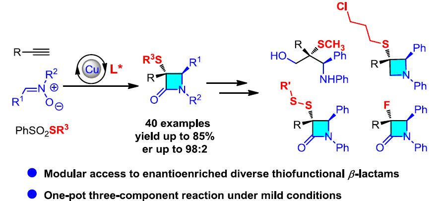 山东大学徐政虎课题组报道了在铜(I)催化条件下,端炔、硝酮与硫亲电试剂之间的不对称三组分Kinugasa反应,获得一系列具有两个连续立体生成中心的含硫手性β-内酰胺衍生物。同时,作者通过进一步对目标产物的合成应用研究,进而证实该反应具有较高的合成应用价值。此外,该反应成功设计的关键在于采用硫亲电试剂,捕捉原位形成的烯醇铜(I)中间体(M1),进而实现上述合成转化。