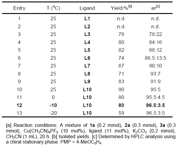 首先,作者以端炔1a、硝酮2a与S-甲基苯磺酸酯3a作为模型底物,进行相关反应条件的筛选(Table 1)。最终,筛选出最佳的反应条件为采用Cu(CH3CN)4PF6为催化剂,L10配体,K2CO3作为碱,CH3CN作为反应溶剂,在-10 ℃反应。最终获得目标产物4a的收率为80%,er为96.5:3.5。