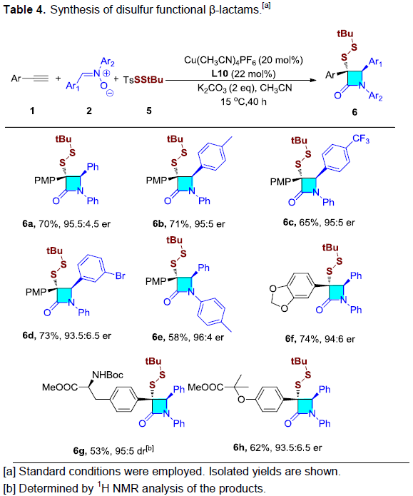 此外,二硫醚化合物广泛存在于天然产物与生物活性分子中。并且,由于其独特的结构与生物学特性,二硫醚类分子同样广泛用于食品化学、化学生物学与制药工业。对称的二硫醚可以通过硫醇的氧化偶联获得,然而,不对称二硫醚的合成仍然存在挑战。并且,迄今为止尚未实现带有β-内酰胺骨架的不对称二硫化物的合成。这里,作者通过选择适宜的二硫醚试剂5,首次实现手性β-内酰胺二硫醚的合成(Table 4)。作者进一步对之前的反应条件进行仔细优化,最终发现将催化剂与配体的用量提高一倍,并将反应温度提升至15 ℃,最终成功获得一系列β-内酰胺二硫醚类化合物6a–6h。