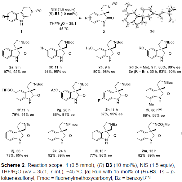 首先,作者以N-Boc保护的四氢-β-咔啉1a作为底物,分别对手性磷酸 (chiral phosphoric acid, CPA)催化剂、氧化剂、溶剂等进行相应的优化筛选(Table 1)。最终确定最佳的反应条件为,采用10 mol%的(R)-B3为手性磷酸催化剂,1.5当量的NIS作为氧化剂,在THF/H2O(v/v = 35:1)的混合溶剂中,−45℃下进行反应,最终获得95%ee的目标产物2a。
