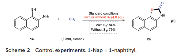 为了进一步阐明反应机理,作者进行一系列相关的控制实验(Scheme 2)。首先,作者发现,向反应体系中加入自由基捕获剂TEMPO或PhSeSePh时,对反应产物及其收率基本无影响。这表明该反应并未涉及单电子转移过程(Scheme 2A)。同时,在相关的反应混合物中,作者能够检测到氨基甲酸酯与尿素副产物的存在。接下来,作者选择萘-2-基氨基甲酸叔丁酯(9)、1,3-二(萘-1-基)脲(10)以及1-异氰基萘(11)作为起始反应物,在CO2或N2气氛以及上述最佳条件下进行反应,最终观察到这类反应物均能够转化为相应目标产物。然而,在N2气氛下,9与10的反应收率偏低,这表明氨基甲酸酯与尿素并非后续硫化过程的关键中间体(Scheme 2B-2D)。此外,作者进一步发现,在标准反应条件下,N-苯基萘-2-胺(12)无法转化为13(Scheme 2E)。综上实验结果,作者推测反应过程中,可能通过动力学活性更高的异氰酸酯中间体,进而获得最终目标产物。随后,该课题组选用2-氨基萘-1-硫醇(14)作为反应底物,在加入S8与未加入的S8情况下进行上述转化,实验发现这两种情况下,均能够以良好的反应收率获得相应预期产物2a(Scheme 2F)。因此,作者推测异氰酸酯的形成以及后续的环化过程可能更有利于相应目标产物的生成。