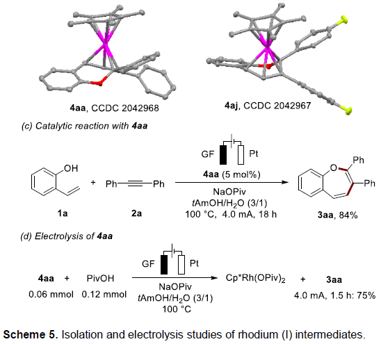 为了进一步了解反应的机理,作者通进行了相关的对照实验(Scheme 5)。首先,通过NMR光谱监测催化过程表明,低价铑配合物4可能在电铑催化的环化反应中处于催化剂静止状态(Scheme 5a)。值得注意的是,可以通过Cp*Rh(OAc)2分别与底物1a和2a(2j)反应,合成相应的铑(I)配合物4aa和4aj(Scheme 5b)。当以配合物4aa为催化剂时,1a和2a可促进反应的进行(Scheme 5c)。此外,4aa的电解释放出产物3aa,并且铑(I)被氧化成铑(III)Cp*Rh(OPiv)2(Scheme 5d)。