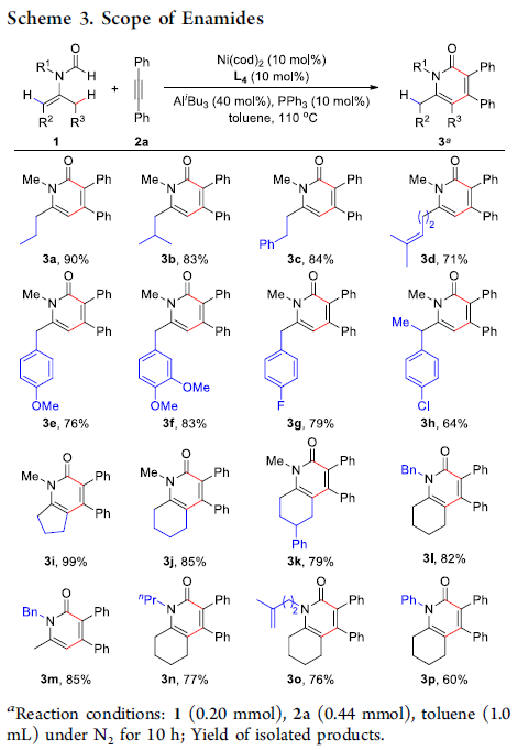 在未引入活化基团情况下,要顺利完成酰基烯胺的区域选择性C(sp3)-H官能团化,较为理想的策略便是选择适宜的N-保护基与催化剂。之前,Nakao与本课题组[2-3]已经研究表明,采用Ni-Al双金属催化剂能够有效地活化一系列N-甲酰基烯胺分子,进而顺利参与C(sp3)-H或C(sp2)-H的环化。受到上述研究的启发,作者选择N-甲酰基烯胺作为反应底物,原因如下:(1)具有Lewis酸性的Al共催化剂能够使酰基烯胺活化,并使乙烯基C-H键的反应活性降低;(2)活性的镍催化中间体由于能够原位形成环状结构,进而获得一定程度的稳定化,并提高C(sp3)-H键活化的催化活性;(3)通过更换不同的配体,可以进一步区分C(sp2)-H/C(sp3)-H键。根据上述设想,作者采用N-甲酰基烯胺1a与二苯乙炔2a作为模型底物,进行相关反应条件的优化筛选(Scheme 2)。实验结果表明,在选择Ni(cod)2与AliBu3作为催化剂,L4作为配体,并加入PPh3,在甲苯溶剂中进行回流,最终获得91%收率的目标产物3a。