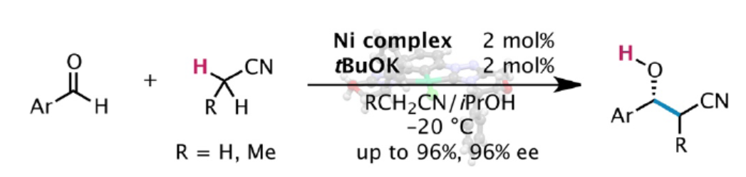 在烷基腈(alkylnitrile)的加成反应中,乙腈与醛的催化不对称加成(ee > 90%)一直具有挑战。近日,日本微生物化学研究所Masakatsu Shibasaki教授课题组在Angew. Chem. Int. Ed.上发表论文,通过使用Ni(II)-卡宾配合物成功实现乙腈与醛的催化不对称加成反应,从而获得对映体富集的β-羟基腈衍生物。其中,日本微生物化学研究所Masakatsu Shibasaki教授和Naoya Kumagai博士为共同通讯作者。