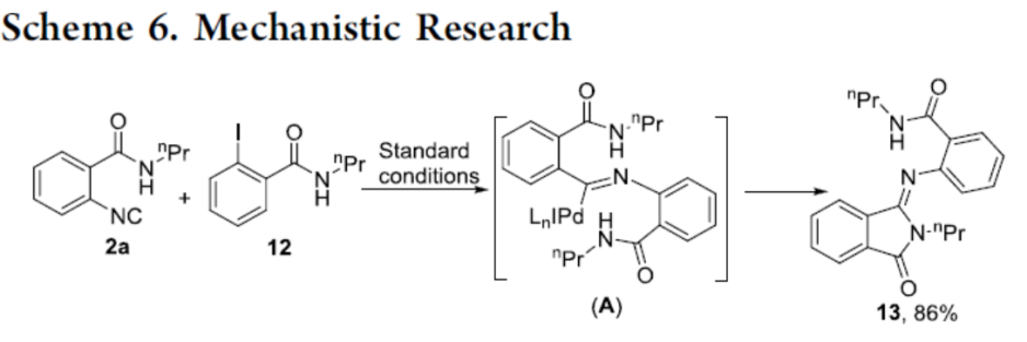 为了进一步了解反应的机理,作者以2-碘-N-丙基苯甲酰胺(12)和2a在标准条件下反应,经中间体A,获得86%收率的形成异吲哚啉酮衍生物13,从而表明在氧化加成后将异氰酸酯插入Pd(II)中间体是一种有利的方法。因此,反应很可能通过偶联-环化而不是环化-偶联的顺序进行(Scheme 6)。