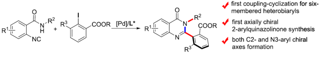 中国科学院广州生物医药与健康研究院朱强课题组报道了一种钯催化N-烷基-2-异氰基苯甲酰胺与2,6-二取代芳基碘化物的环酰胺化反应,可获得轴手性2-芳基喹唑啉酮衍生物,具有良好的收率和阻转选择性。同时,当以N-(2,4-二甲氧基苯基)-2-异氰基苯甲酰胺作底物时,会产生具有两个立体异构轴的2,3-二芳基喹唑啉酮,具有中等的非对映选择性和良好的对映选择性。此外,反应涉及偶联-环化的过程。