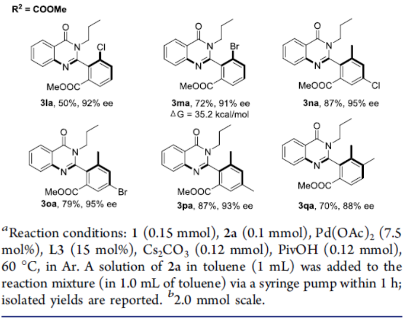首先,作者以2-碘-3-甲基苯甲酸甲酯(1a)和2-异氰基-N-丙基苯甲酰胺(2a)作为模型底物,进行了相关反应条件的筛选(Table 1)。反应的最佳条件为,以Pd(OAc)2为催化剂,L3为配体, Cs2CO3为碱,可在60 °C下反应,获得93%收率和94%ee的产物3aa。