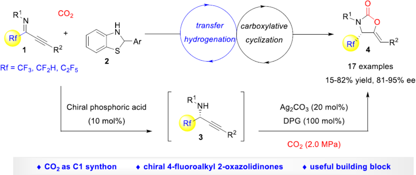 华东师范大学周锋课题组报道了一种新型催化不对称转移氢化-羧基化环化的策略,以CO2作为C1合成子,从而高效地构建具有4-三氟甲基、二氟甲基以及五氟乙基取代基的手性2-恶唑烷酮。同时,通过后期衍生化可合成具有价值的手性氟烷基氨基醇。