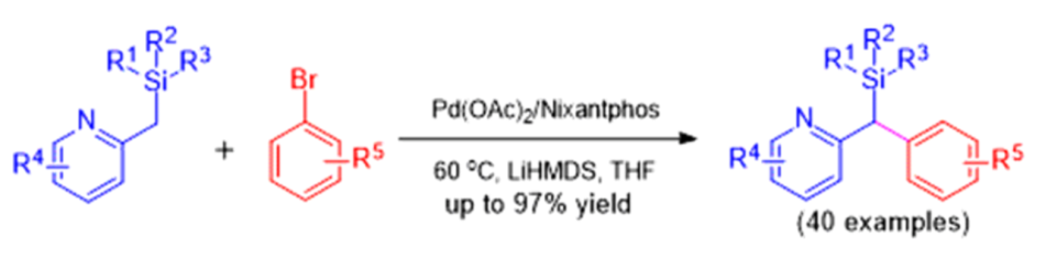 南京工业大学毛建友教授课题组报道了一种通过钯催化2-吡啶基甲基硅烷与芳基溴化物的交叉偶联反应,从而合成芳基(2-吡啶基)-甲基硅烷衍生物。同时,该反应具有良好的底物范围,各种给电子或吸电子的芳基溴均可顺利反应。此外,通过克级实验以及后期衍生化实验,进一步证明了反应的实用性。