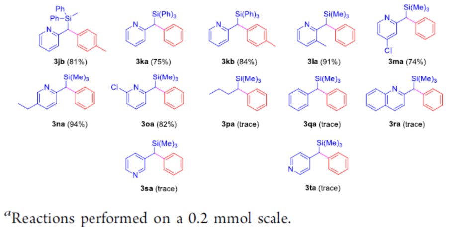 随后,作者对甲硅烷基底物1进行了相关的扩展(Scheme 3)。当使用三乙基硅烷时,以高收率生成产物3ba和3bb。对于三异丙基硅烷1c,可获得产物3cb,收率略有降低。同样,二甲基(正丙基)硅烷1d和二甲基(正丁基)硅烷1e底物,可获得以高收率的相应产物3da,3db,3ea和3eb。二甲基(叔丁基)硅烷1f也是合适的底物,获得高收率的产物3fa和3fb。值得注意的是,对于空间位阻较大的硅烷底物,如二甲基-(2,3-二甲基丁烷-2-基)硅烷1g,导致收率略有下降,以77%的收率获得所需的产物3gb。其次,若将硅烷的碳链延长,如二甲基(正辛基)硅烷1h,在标准条件下反应时,分别获得89%和85%收率的3ha和3hb。同时,各种芳基取代的硅烷也为合适底物,以72-84%收率生成相应的产物3ia、3ib、3ja、3jb、3ka和3kb。此外,当使用取代的2-吡啶底物时,以良好收率(74-94%)获得相应产物3la–3oa。然而,在标准条件下,烷基(1p)、简单苯基(1q)和其他杂环基(如1r、1s和1t))只获得痕量目标产物。