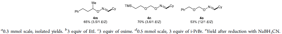 随后,作者对肟的范围进行了扩展。首先,芳基上具有不同官能团,如氟、氯、三氟甲基、甲基等,均可获得高收率的相应产物4a–4f。同时,苯乙烯衍生物,也可获得优异收率的产物4g。其次,末端取代基为苯基(4h)、酯(4i)、氰基(4j)和受保护的伯胺(4k),均可顺利反应。具有仲烷氧基的底物,也为合适的底物(4l,4m)。此外,具有易于除去的SEM和BOM基团的底物,也获得中等至良好的收率的4n和4o,为获得O-未保护的肟提供了可能。