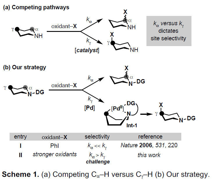 美国密西根大学Melanie S. Sanford课题组报道了一种通过将底物与Pd催化剂配位后,再加入氧化剂的策略,从而实现脂环胺的Cγ-H的活化。通过该策略,成功实现了C(sp3)-卤素、氧、氮、硼和硫键的构建。值得注意的是,通过对Cγ-H与Cα-H功能化的相对速率的控制,对于反应至关重要。