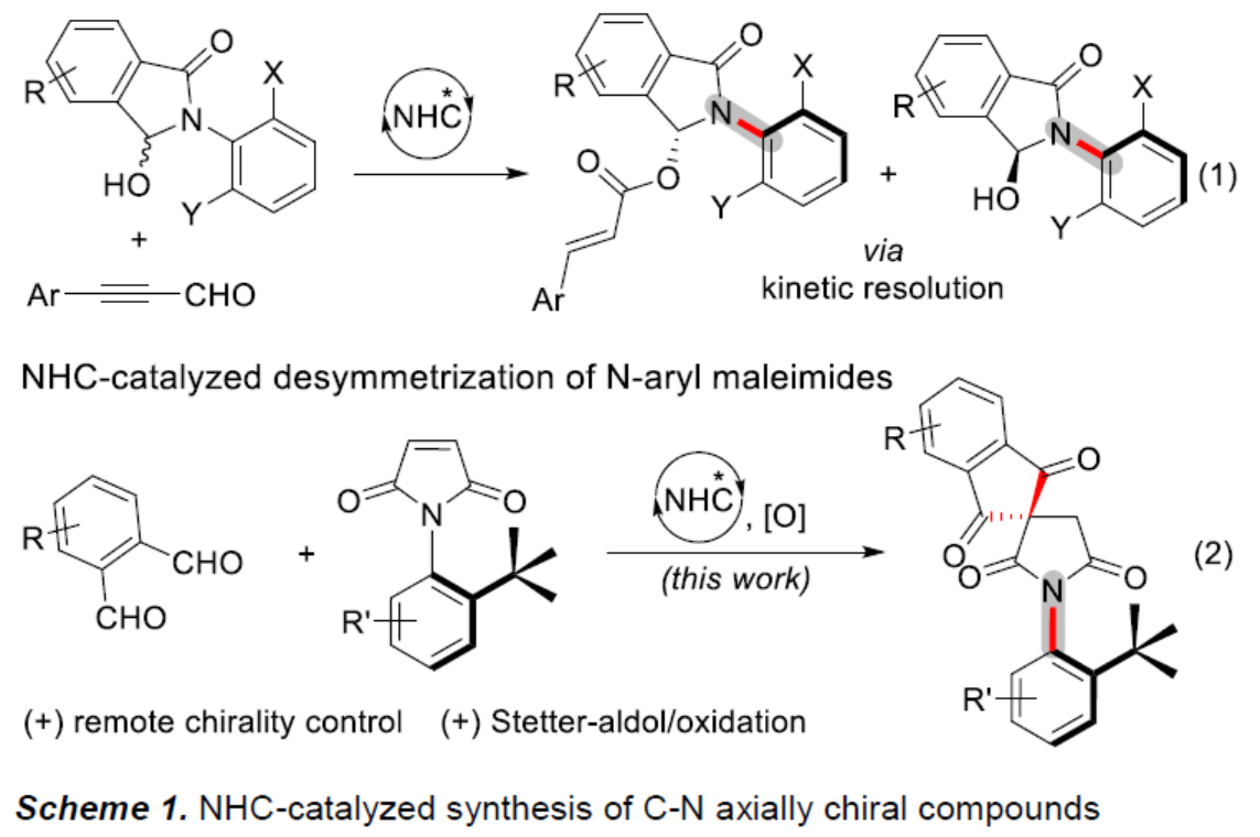自Curran等[1]首次通过马来酰亚胺和N-烷基苯甲酰胺来构建具有C-N轴手性的化合物以来,催化阻转选择性合成C-N轴手性分子受到大量关注。近年来,已报道了多种过渡金属催化或有机催化的策略用于合成具有C-N轴的手性分子。另一方面,虽然已实现N-杂环卡宾(NHC)催化阻转选择性合成C-C轴向手性化合物[2],但对于NHC催化合成具有C-N轴手性化合物却很少被研究。2018年,Wang等报道了NHC催化从而合成具有C-N轴手性化合物[3],涉及苯甲酸酯动力学拆分过程(Scheme 1, eq 1)。鉴于动力学拆分策略的局限性,作者设想可通过NHC催化N-芳基马来酰亚胺的去对称化反应,从而合成具有轴手性C-N键的N-芳基琥珀酰亚胺(具有原子经济和阻转选择性)(eq 2)。值得注意的是,近期Chi等[4]报道了NHC催化环状1,3-二酮的去对称化反应合成螺环化合物。