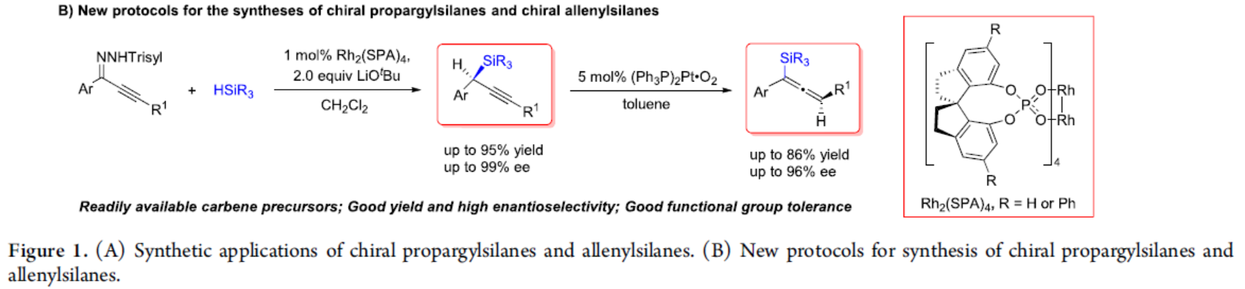 有机硅化合物广泛应用于有机合成、材料科学和药物化学中,其中手性炔丙基硅烷(propargylsilanes)和手性丙二烯硅烷(allenylsilanes)作为通用的合成子可进行多种转化,以合成具有价值和潜在价值的化合物(Figure 1)。迄今为止,对映体富集的炔丙基硅烷主要是在苛刻条件下,以旋光的起始原料合成,而在不对称催化合成却很少被研究。近年来,轴手性丙二烯硅烷的合成已取得一定的成果,但大多数已知方法基于炔丙醇衍生物的取代反应。因此,对于手性炔丙基硅烷和手性丙二烯硅烷的多样性合成缺有待开发。在此,本文将报道一种以易得的炔基磺酰腙为底物,通过炔基卡宾不对称插入至硅烷的Si-H键中,从而合成对映体富集的炔丙基硅烷。同时,通过铂催化可进一步进行立体定向异构化,获得相应的手性丙二烯硅烷。