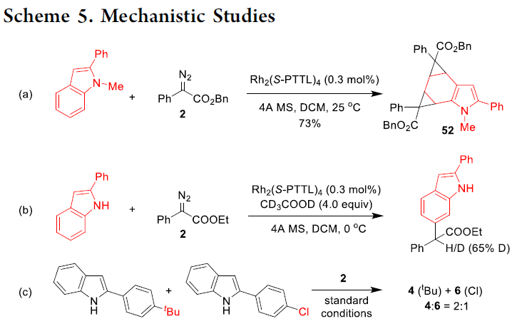 为了进一步了解反应的机理,作者进行了相关的对照实验(Scheme 5)。在标准反应条件下,N-甲基-2-苯基吲哚与重氮酯2进行偶联反应,获得73%收率的二环丙基化产物52,从而表明N-H基团的氢键对于实现C(6)选择性至关重要。同时,当在AcOD中进行1和2的偶联反应时,在烷基位发生了显着的H/D交换,从而表明C-H到C-M的配体到配体的氢转移(LLHT)的可能性(Scheme 5b)。此外,竞争性实验表明,富电子吲哚在动力学上更具反应性(Scheme 5c)。