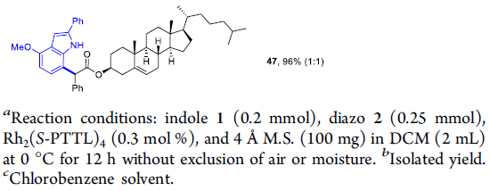 首先,作者以2-苯基吲哚(1)和重氮酯(2)作为模型底物,进行了相关反应条件的筛选(Table 1)。反应结果表明,当以Rh2(S-PTTL)4为催化剂,可在DCM溶剂中反应,获得85%收率的C(6)选择性烷基化产物3。
