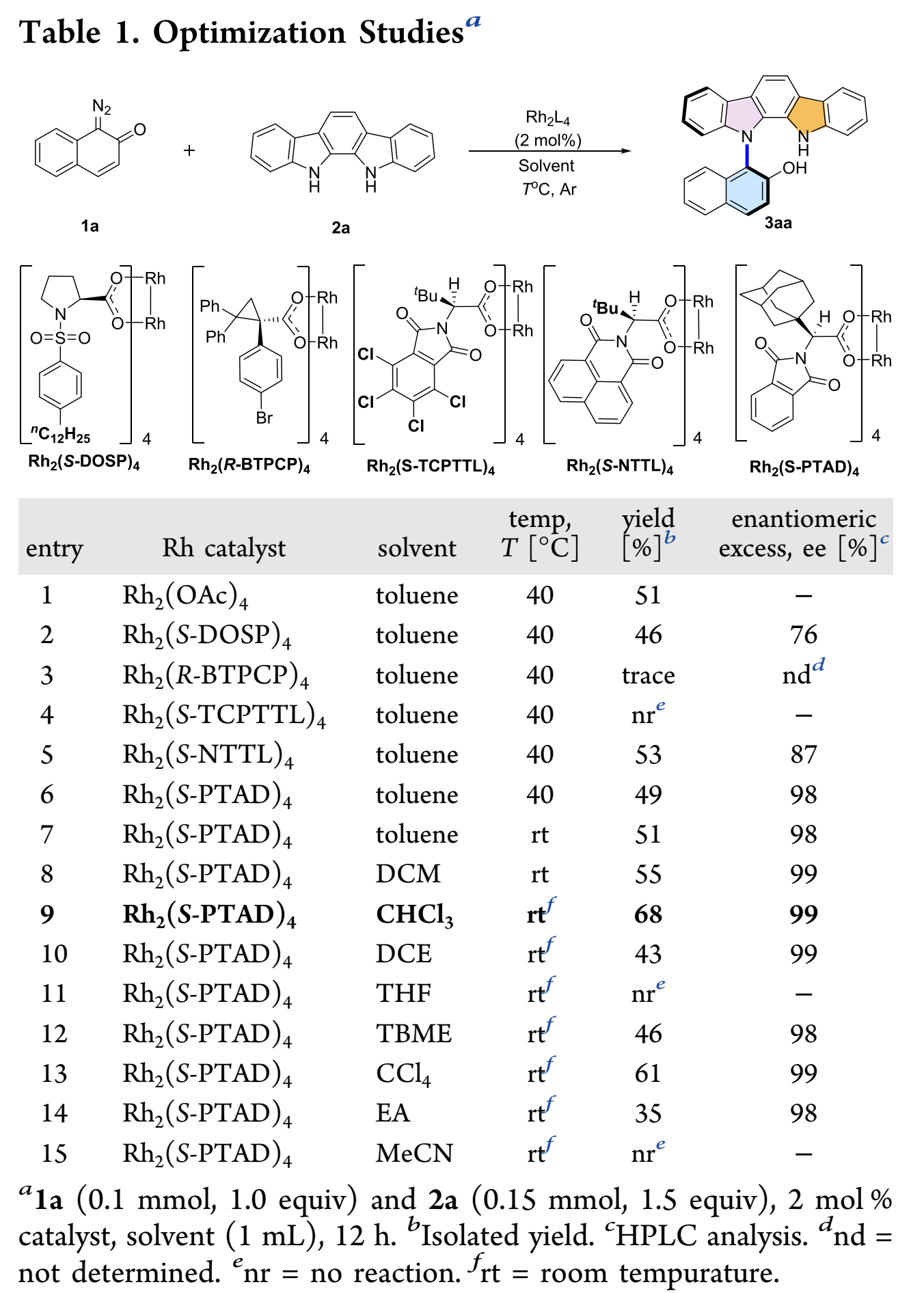 作者以重氮萘醌1a和吲哚并[2,3-a]咔唑2a为模板底物,通过对催化剂、溶剂以及温度等条件进行筛选,确定最优条件(Table 1)为:以2 mol%Rh2(S-PTAD)4为催化剂,CHCl3为溶剂,底物在室温条件下反应12 h,能以68%的收率和99%的对映选择性得到轴手性产物3a。