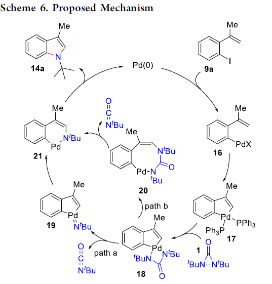 随后,作者提出了一种可能的反应机理(Scheme 6)。首先,Pd(0)催化剂氧化加成至芳基碘化物上,形成芳基Pd(II)配合物16,经分子内乙烯基C-H活化生成钯(II)环配合物17。随后,配合物17与二叔丁基二氮丙啶酮(1)反应,生成钯(IV)环配合物18。在Path a中,配合物18释放异氰酸叔丁基酯,生成Pd(IV)-氮杂环丁烷19,再经连续两次还原消除形成吲哚14a,并再生Pd催化。在Path b中,配合物18通过还原消除形成八元钯(II)环配合物20,再释放异氰酸叔丁酯以及经还原消除后,即可获得吲哚14a。