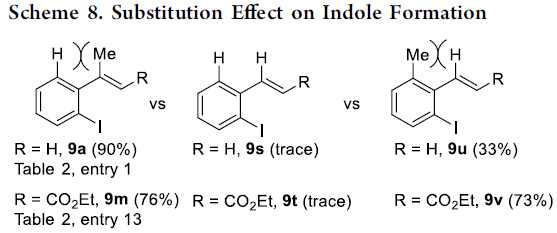 此外,作者还对空间位阻和取代效应进行了研究。当使用(E)-三取代烯烃9m和(Z)-三取代9r在标准条件下反应时,仅有(E)-9m顺利反应,获得76%收率的14m,从而表明吲哚形成涉及分子内乙烯基C-H键的活化(Scheme 7)。同时,烯烃取代基对反应也至关重要(Scheme 8)。当α-甲基苯乙烯中的甲基被去除时,收率从90%下降到不足5%(9avs9s)。但当将甲基邻位引入乙烯基时,会形成大量的吲哚(9uvs9s)。在9m、9t和9v下也观察到了相同的趋势。这些结果表明乙烯基和苯基之间的空间排斥可以促进C-H键的活化。