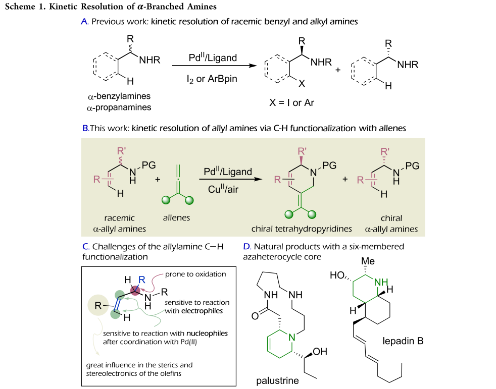 近日,Santiago de Compostela大学的M. Gulías教授团队采用Pd催化联烯C-H键活化策略,成功实现α-支链烯丙基三氟甲磺酰胺的动力学拆分方法学,并以高度的对映选择性与中等程度的反应收率,获得一系列四氢吡啶类化合物 (Scheme 1B)。而四氢吡啶类化合物则是构建一系列天然产物与生物活性化合物的关键砌块 (Scheme 1D)。
